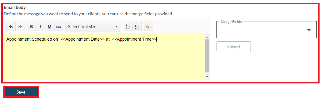 Next, enter the Email Body text. You may wish to provide additional instructions or information to the client here. A Merge Fields option is also available for this section.