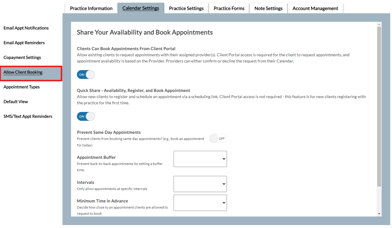 Practice owners and administrators have access to Settings and can configure Calendar Settings for the practice.