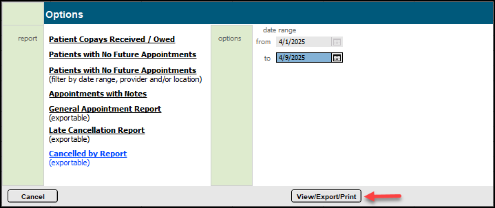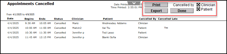 4. After the report runs, you can Print or Export. You are also able to filter by Clinician or Patient (or both) cancellation.