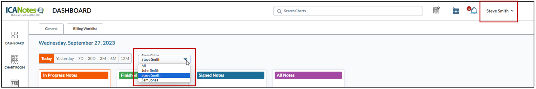 On the Dashboard, clinician (Steve Smith) will be able to access all the other clinicians from the dropdown as the clinician has access on the Clinical Team’s Charts Only feature.