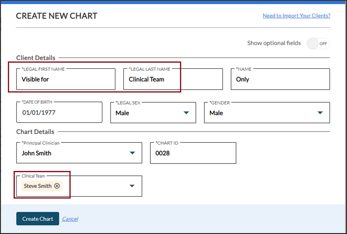 Only the administrator (John Smith) can add the clinicians to the clinical team withing the client’s chart.