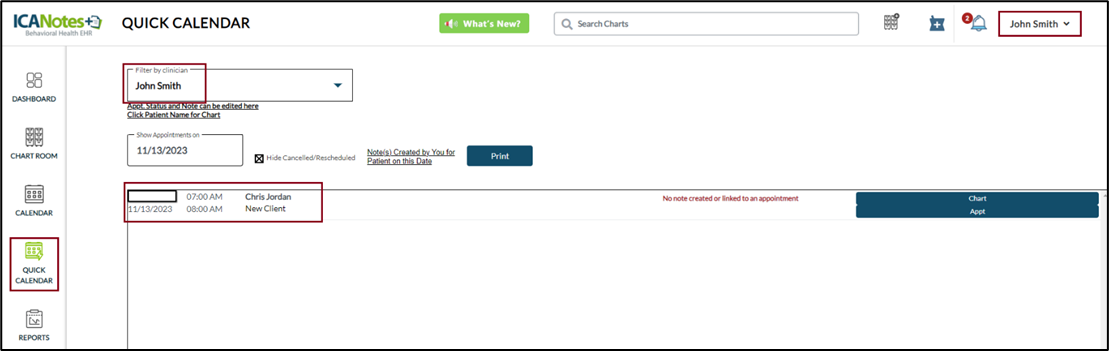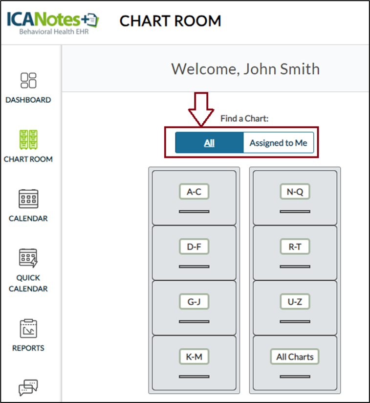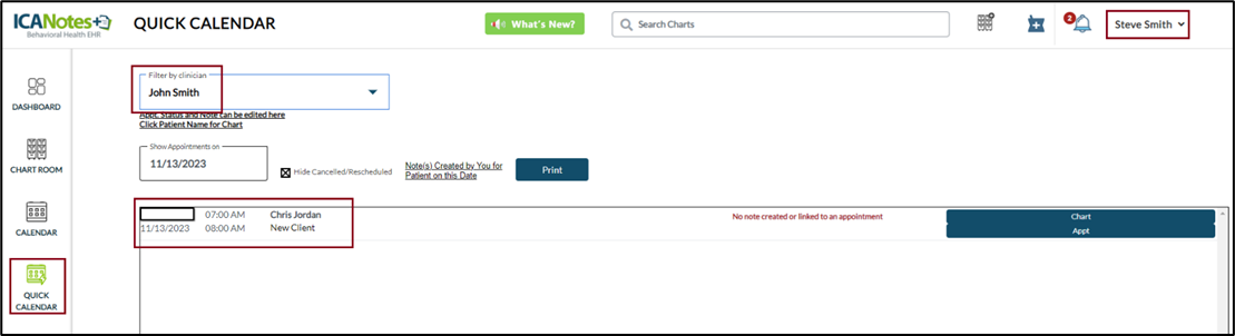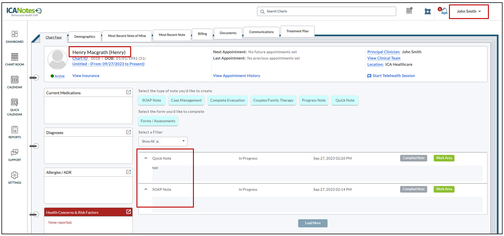 When the Clinician (Steve Smith) accesses the chart room, he will be able to see the client’s name as shown in the screen below.