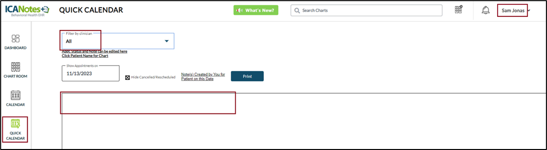 On the Dashboard, supervisor (Sam Jonas) will not be able to access other clinicians from the dropdown as the clinician has access on the Clinician’s Charts Only feature.