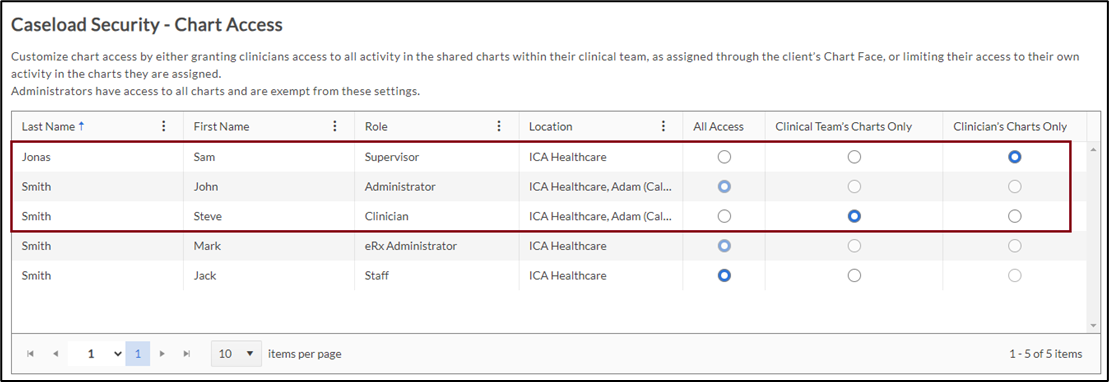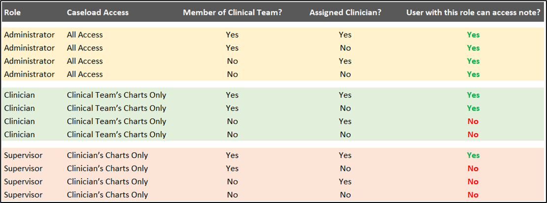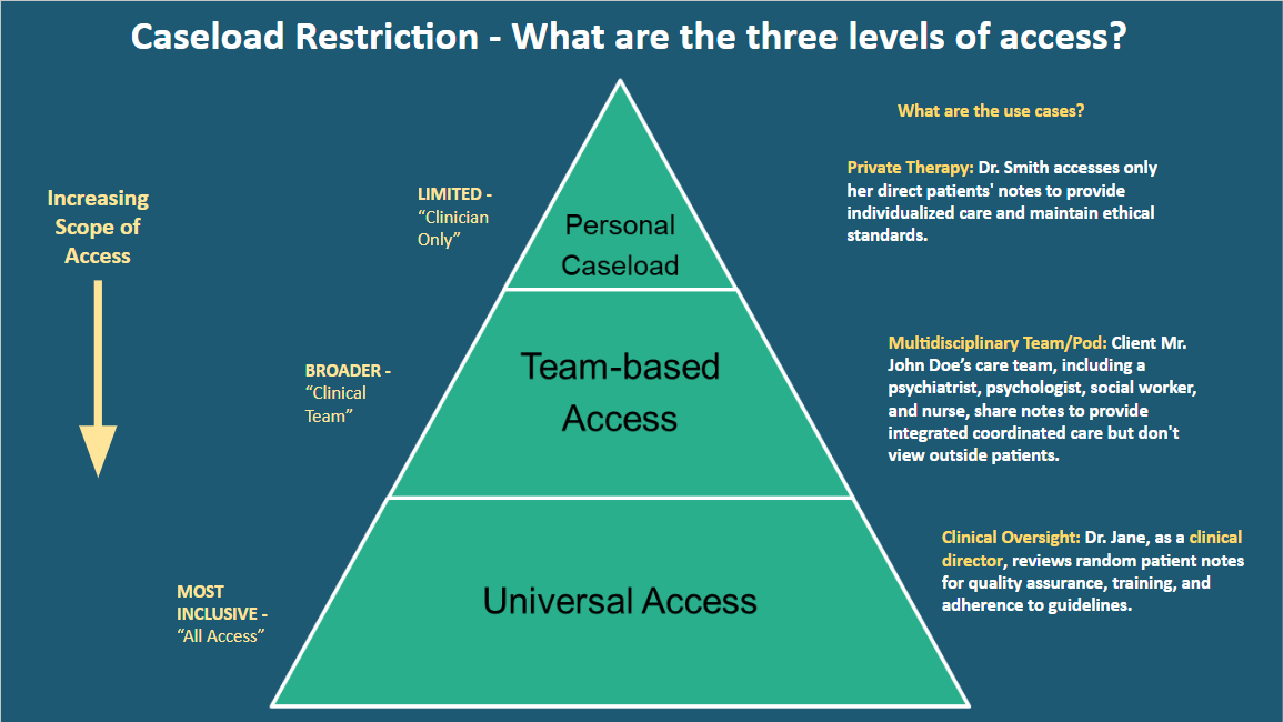 In summary, the Caseload Security feature offers the following three distinct access levels that can be assigned to clinicians based on their responsibilities and requirements.