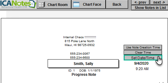 The second way is from the Finished Note preview. Click the 'Set Date/Time' button toward the top right of the finished note.
