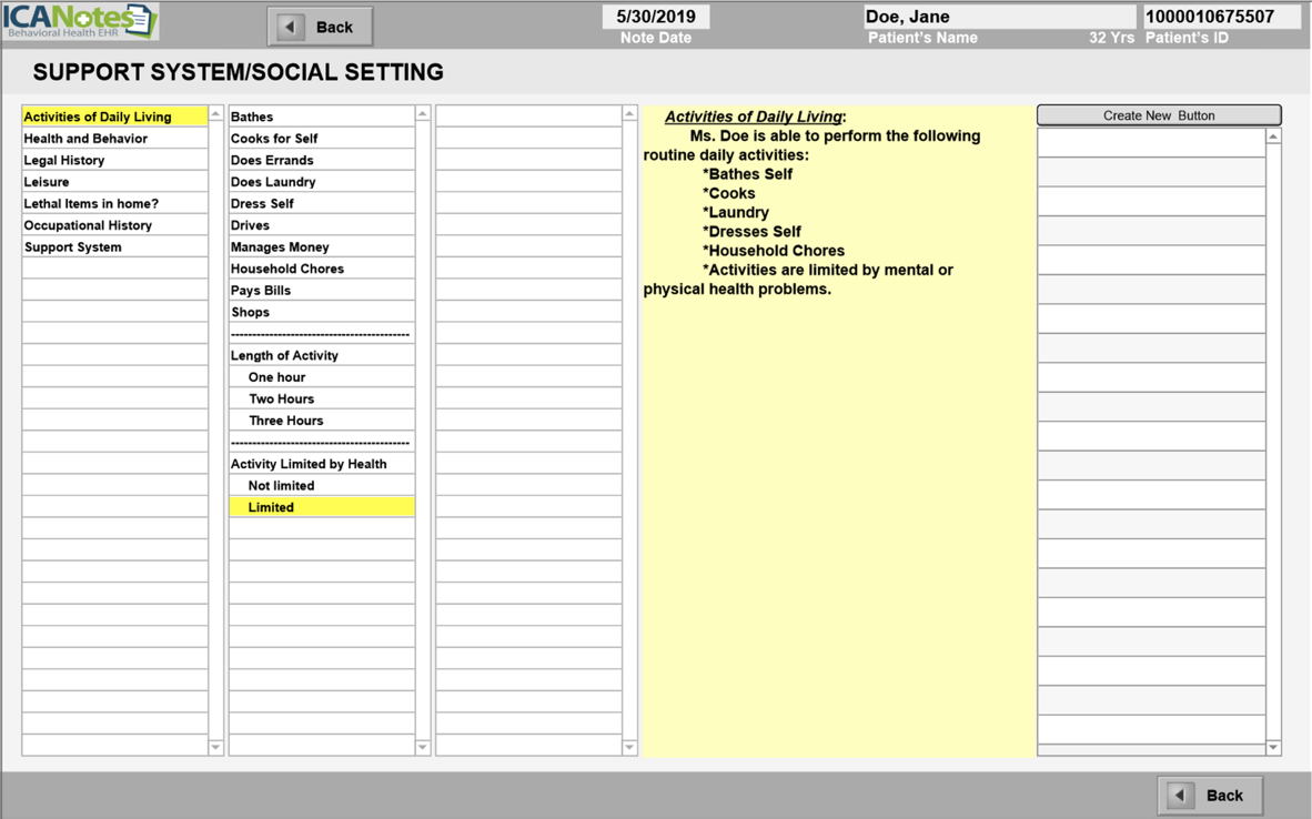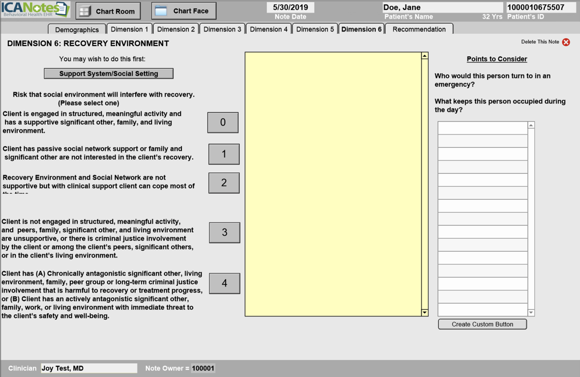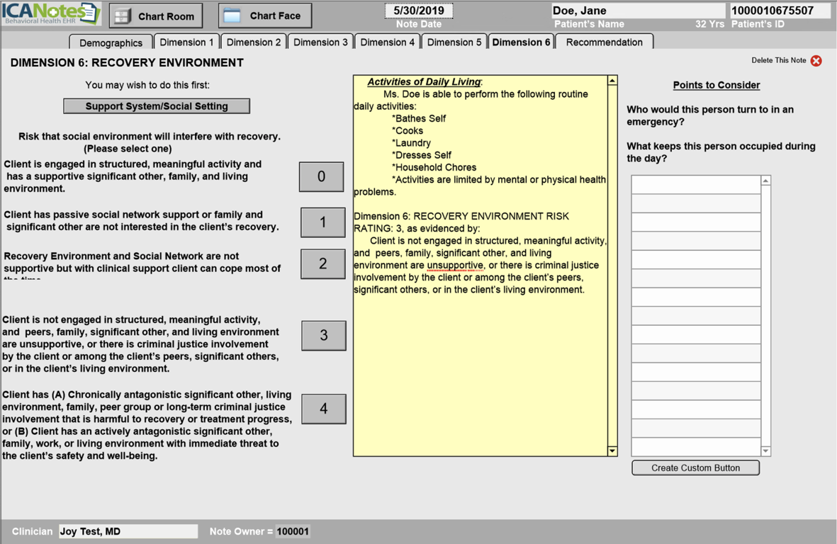 Risk that social environment will interfere with recovery buttons give the description that you can pull into the report. In this example, 3 was chosen and the description of 3 was pulled into the yellow field (at the bottom of the yellow field). On the right, there is a list of points to consider while filling out this tab.