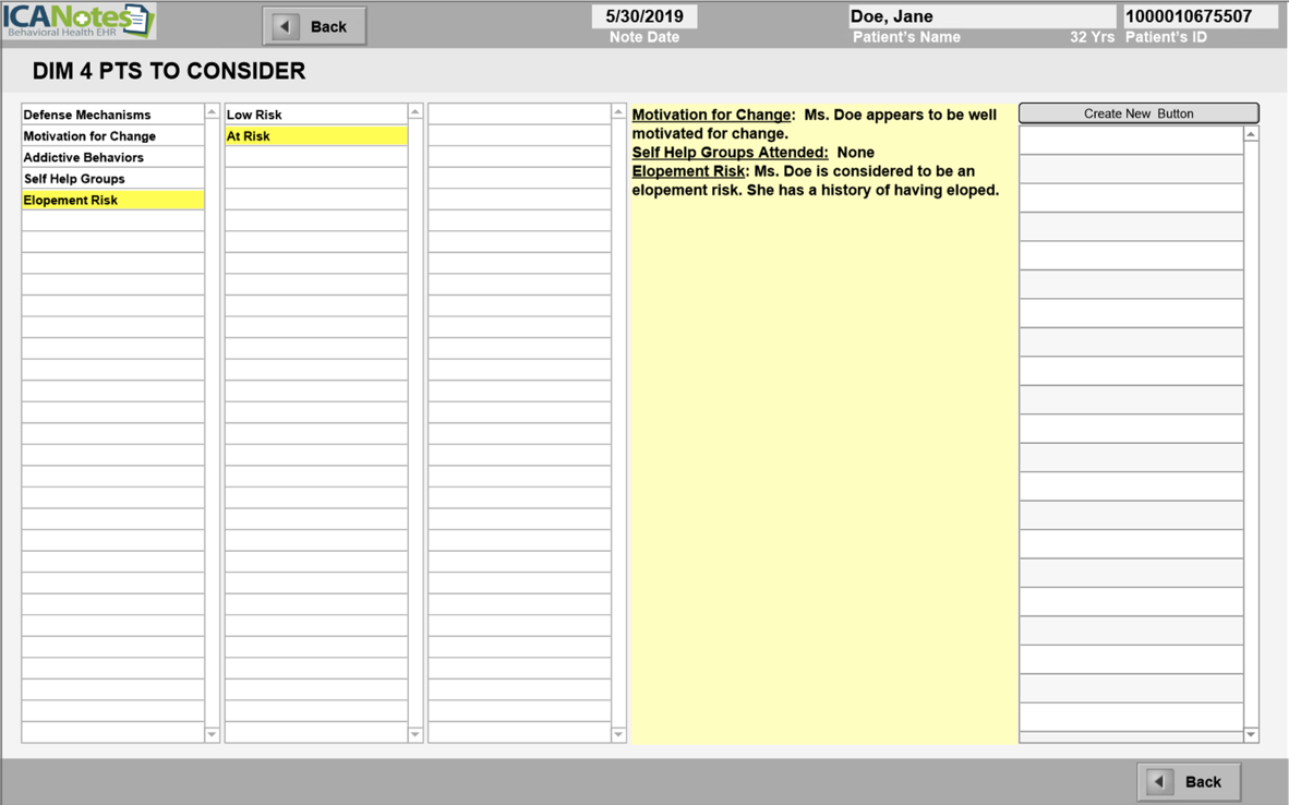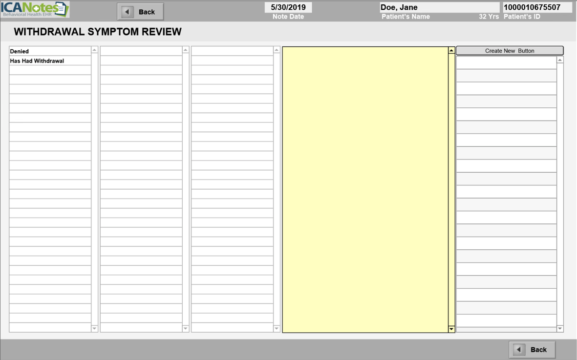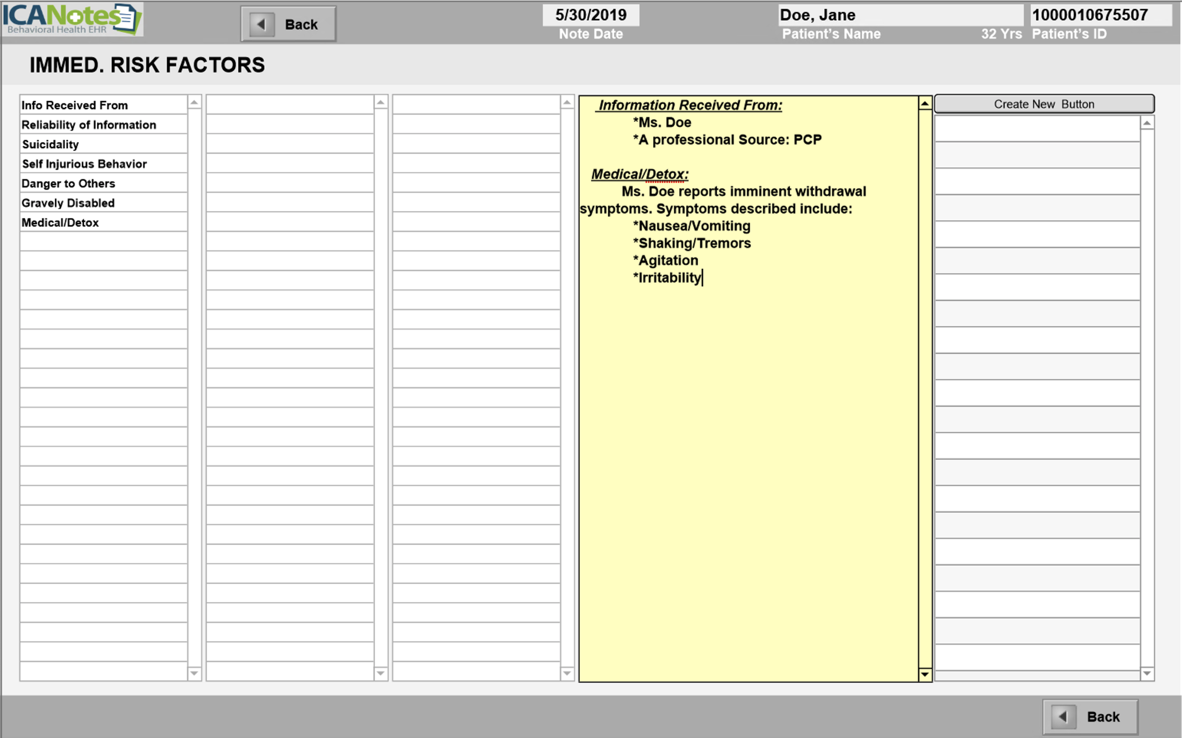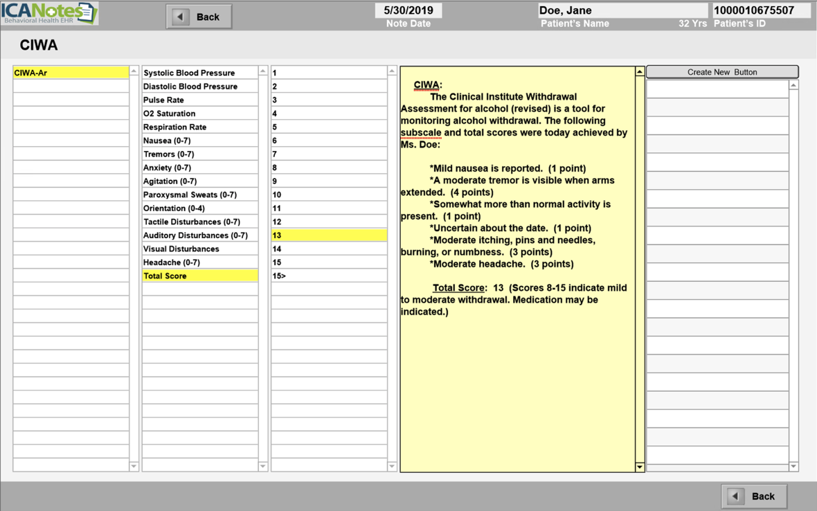 Intoxication / Withdrawal Risk Rating buttons give the description that you can pull into the report. In this example, 4 was chosen and the description of 4 was pulled into the yellow field (at the very bottom of the yellow field).