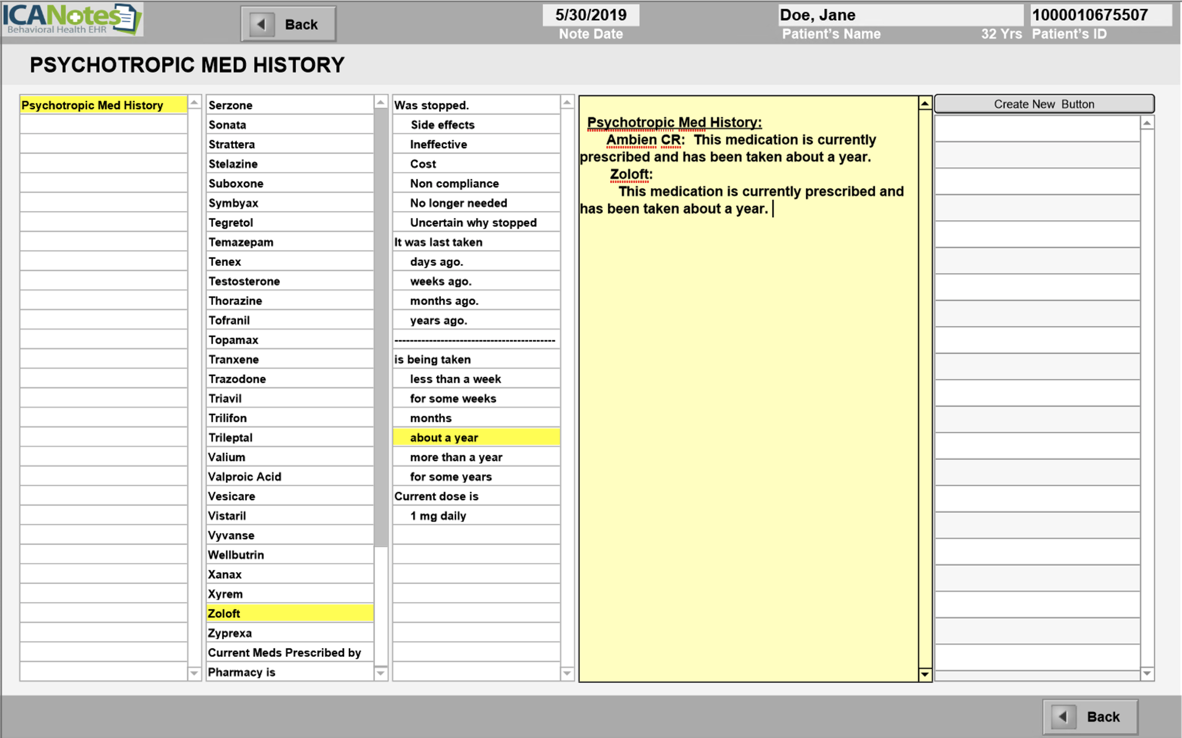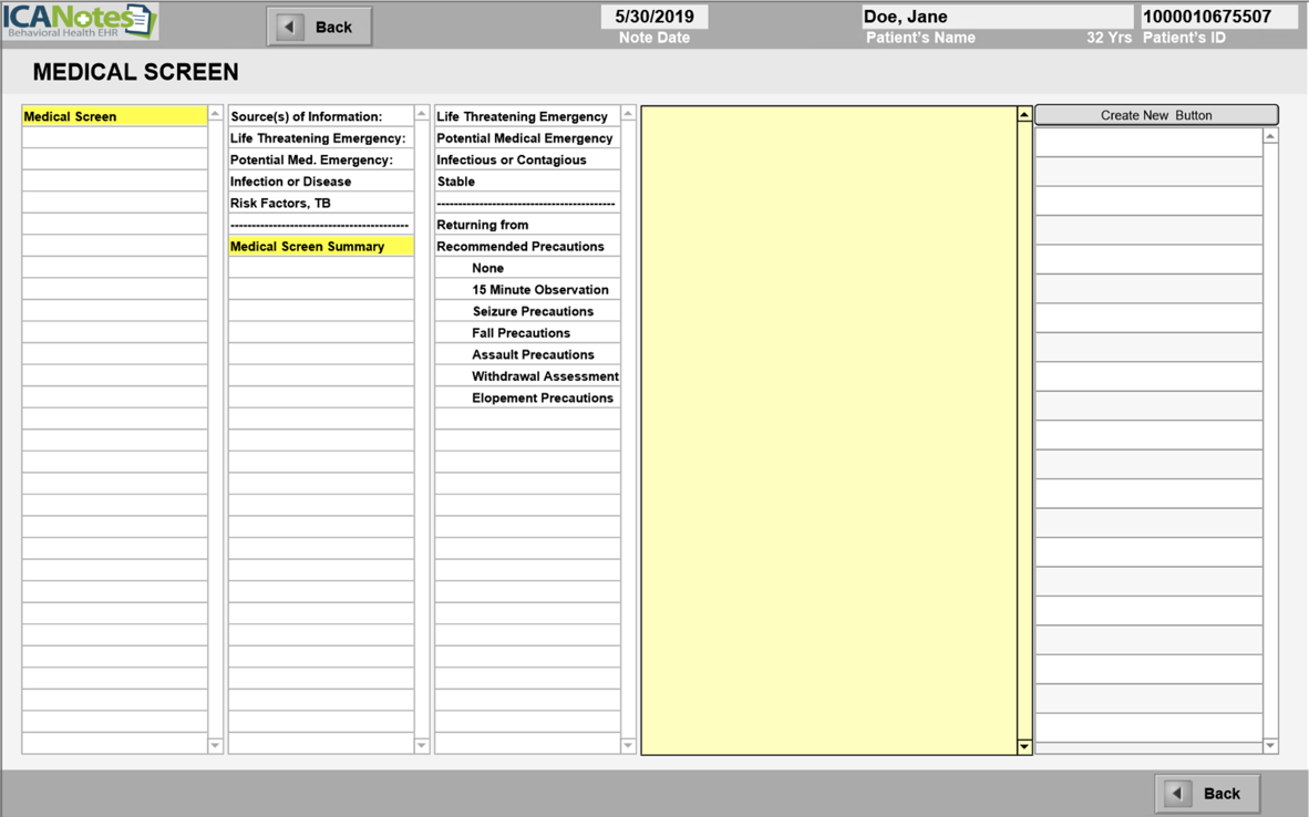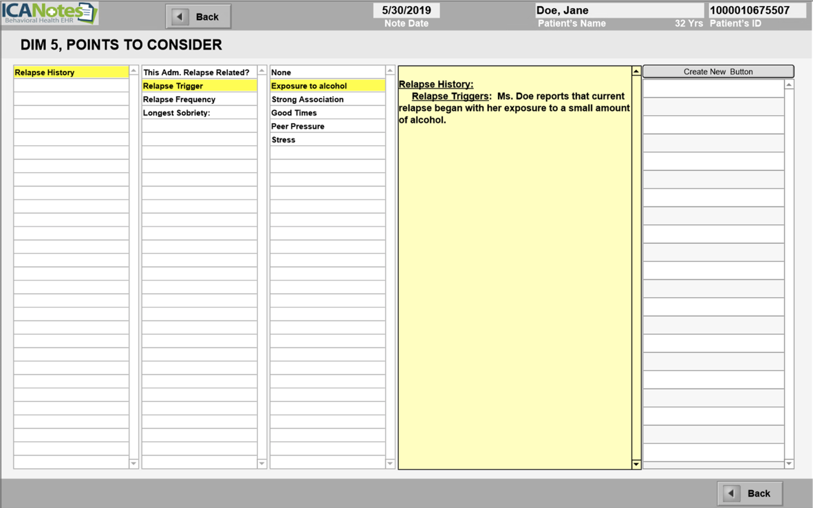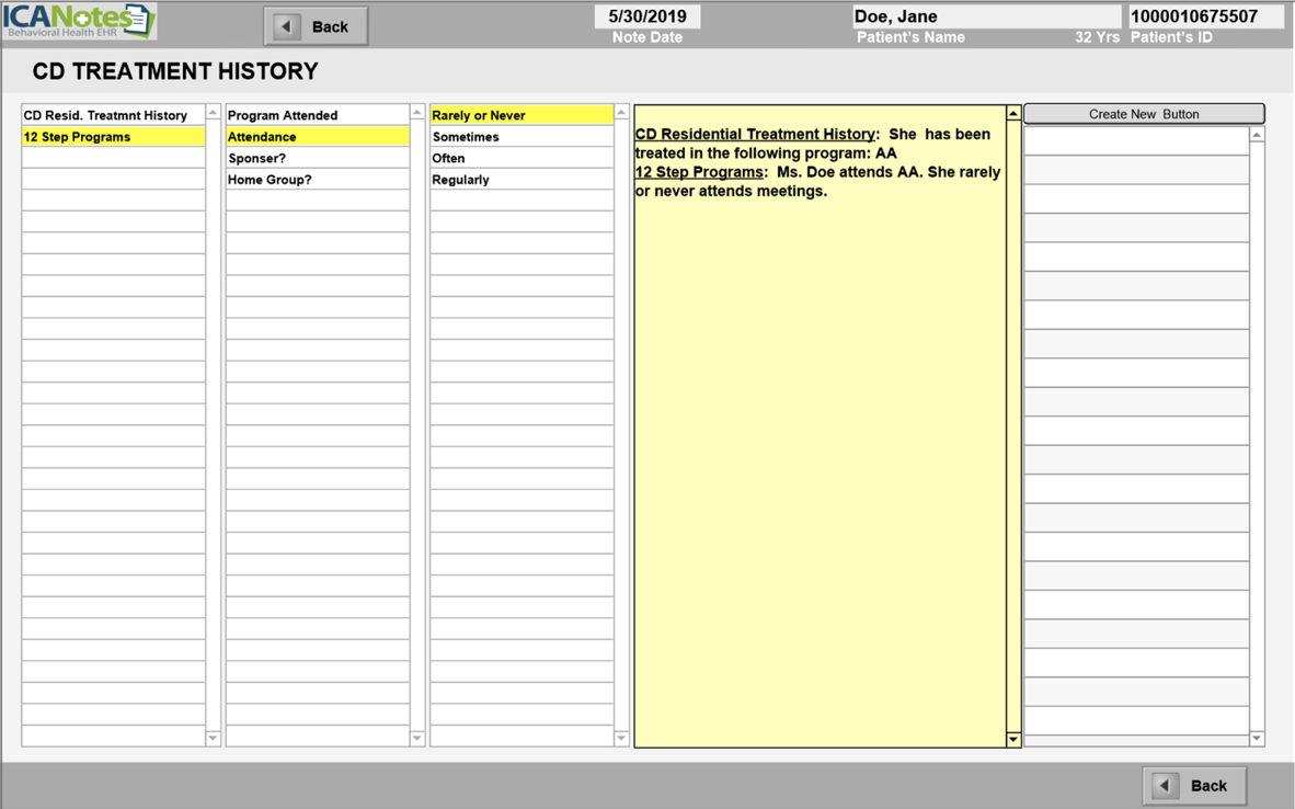Intoxication / Withdrawal Risk Rating buttons give the description that you can pull into the report. In this example, 4 was chosen and the description of 4 was pulled into the yellow field (at the very bottom of the yellow field).
