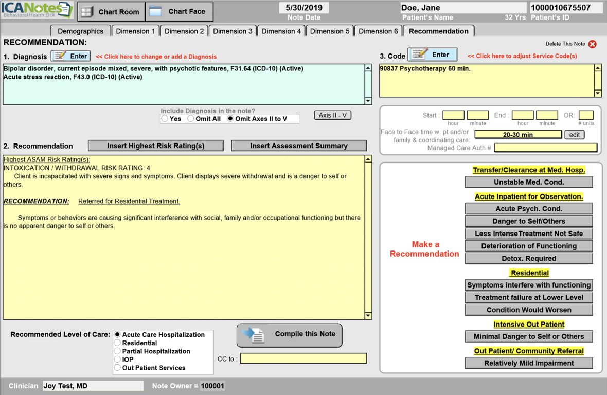 8. On the last tab, Recommendation window, fill out the tab from top to bottom, left to right. When the tab has been completed, click the Compile this Note button.