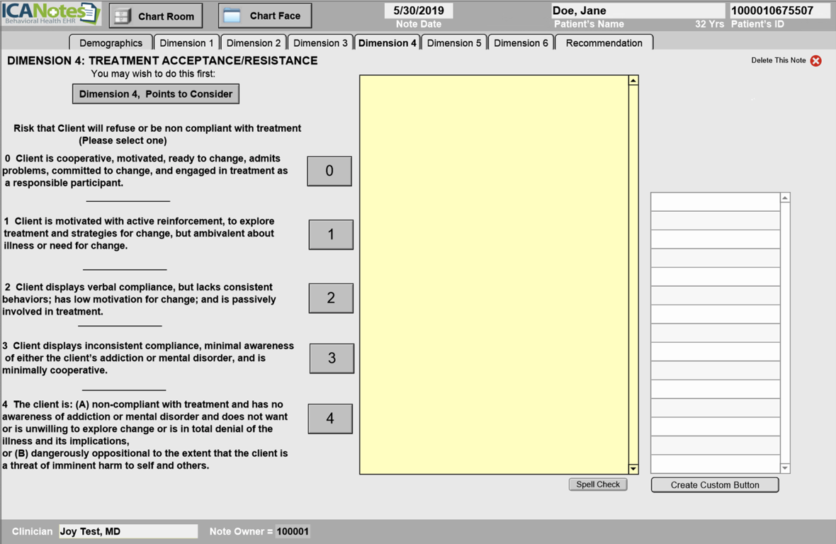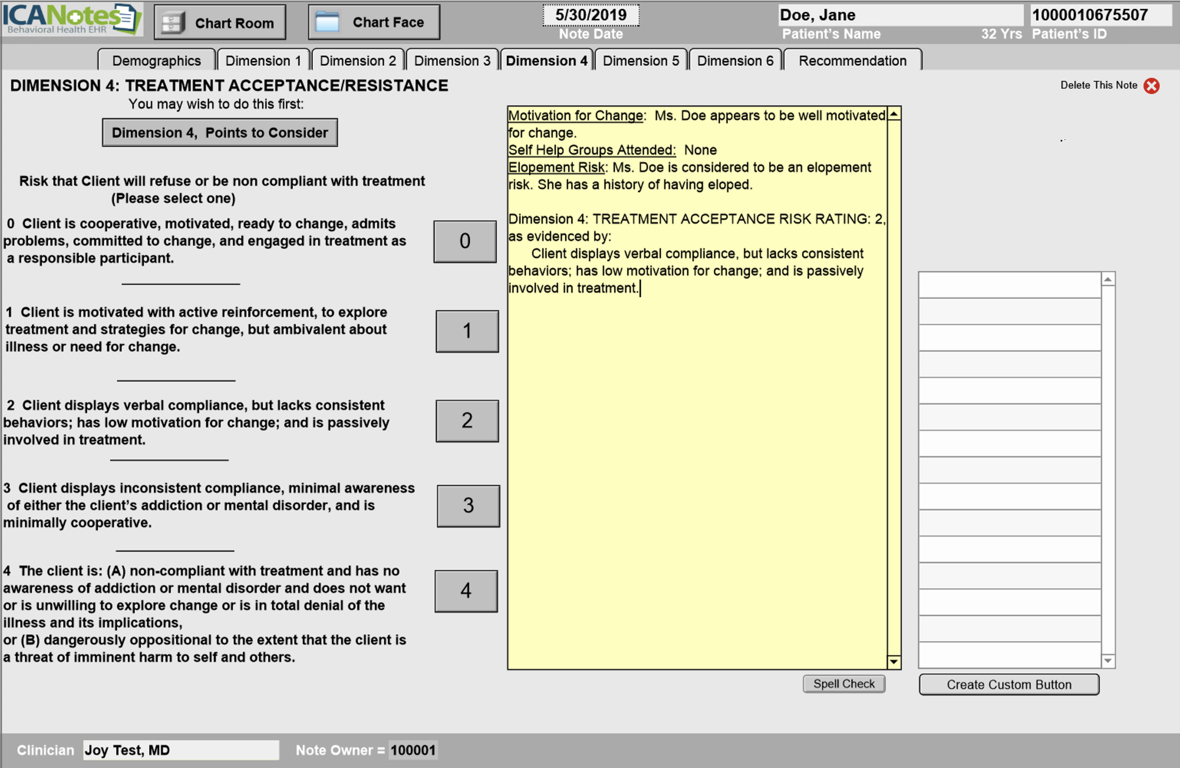 Risk that Client will refuse or be non compliant with treatment buttons give the description that you can pull into the report. In this example, 2 was chosen and the description of 2 was pulled into the yellow field (at the bottom of the yellow field).