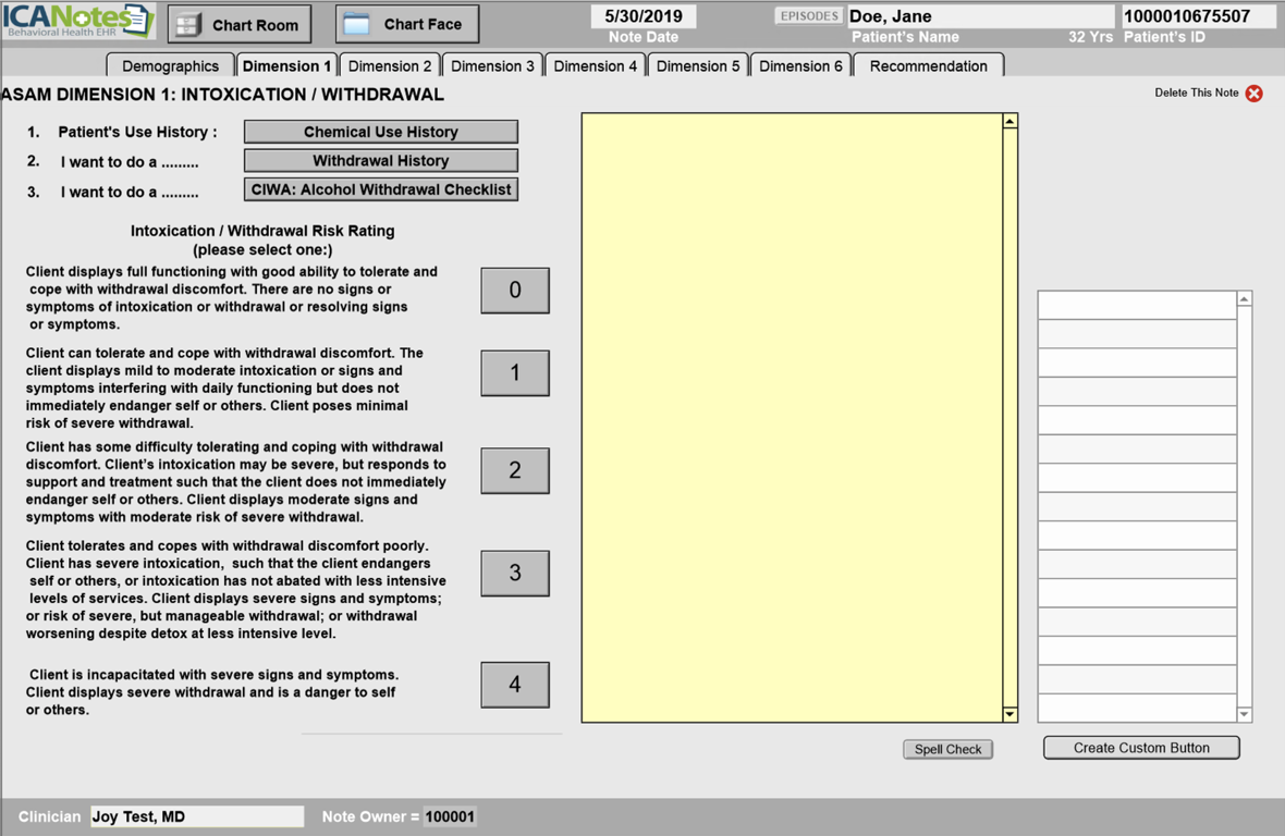 2. The Dimension 1 tab is for ASAM Dimension 1: Intoxication / Withdrawal window.