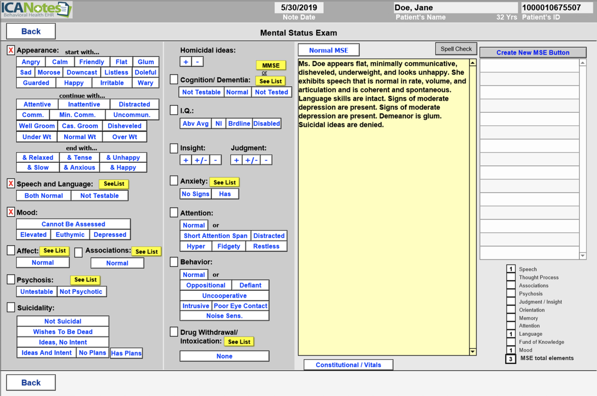 button opens to the Mental Status Exam window (from the Therapy Progress Notes).
