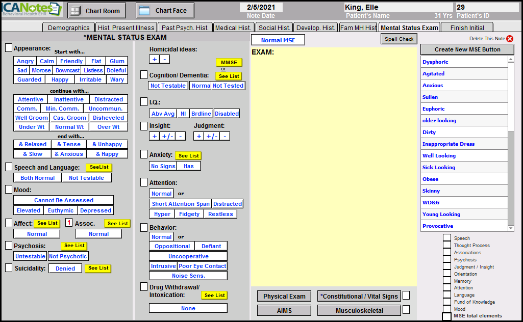 The account used for the images in this section had Counselor discipline. Select from the Shrubs along the right to add content, or customize your note content with Custom Buttons. Follow this workflow throughout all of the tabs in the Complete Evaluation.