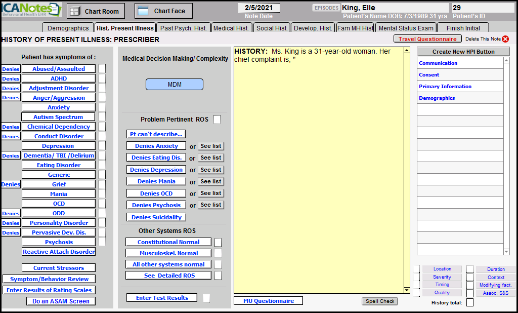 The Hist. Present Illness tab will not carry content forward from previous Assessments/Evaluations. This tab corresponds with the Problem Tab available to the Counselor discipline shown above.