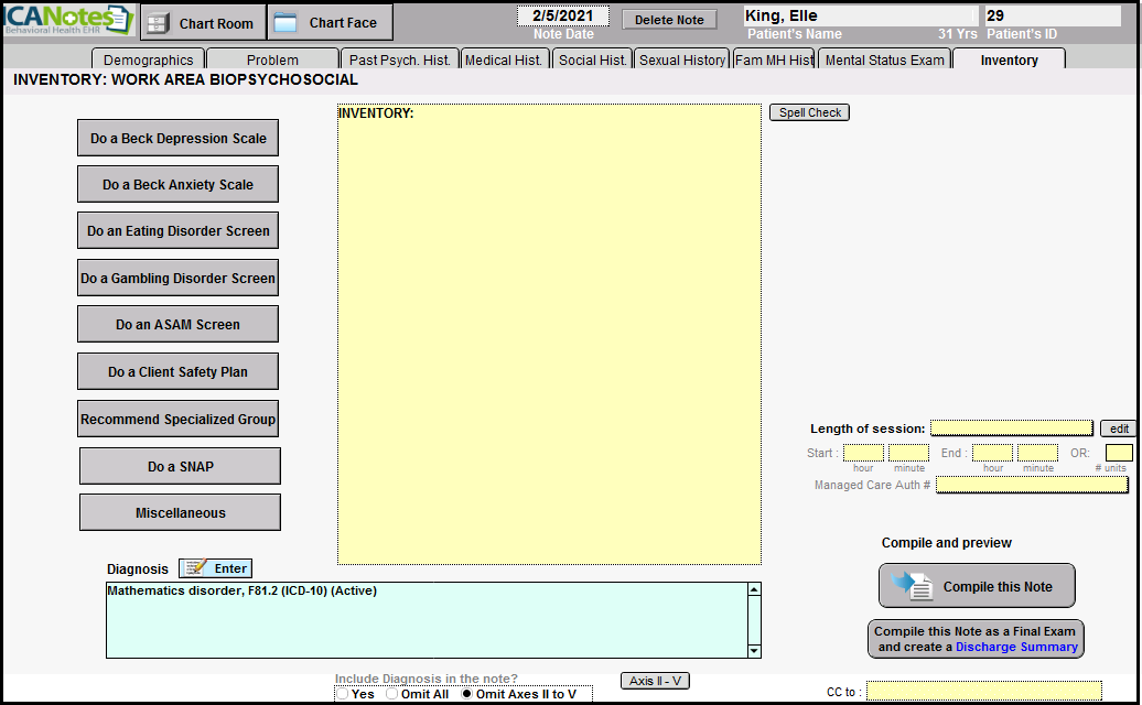 Finalize your Complete Assessment/Evaluation on the Inventory tab. Be sure to click on 'Compile This Note' to save all of the content in a printable layout.