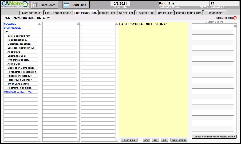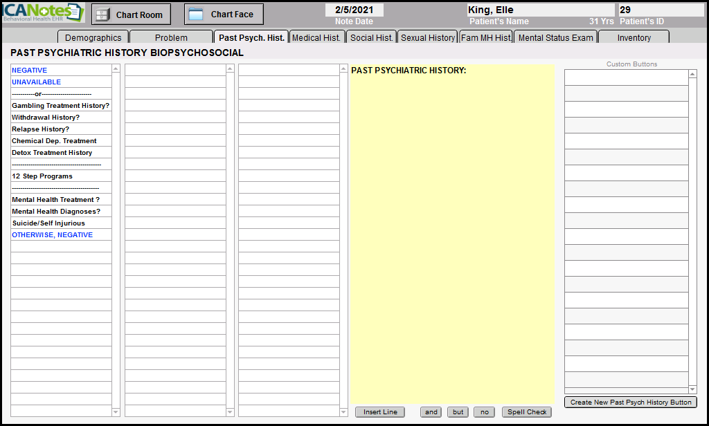 The Past Psych, Hist. Tab allows you to document on psychiatric treatment or hospitalization the patient may have had.