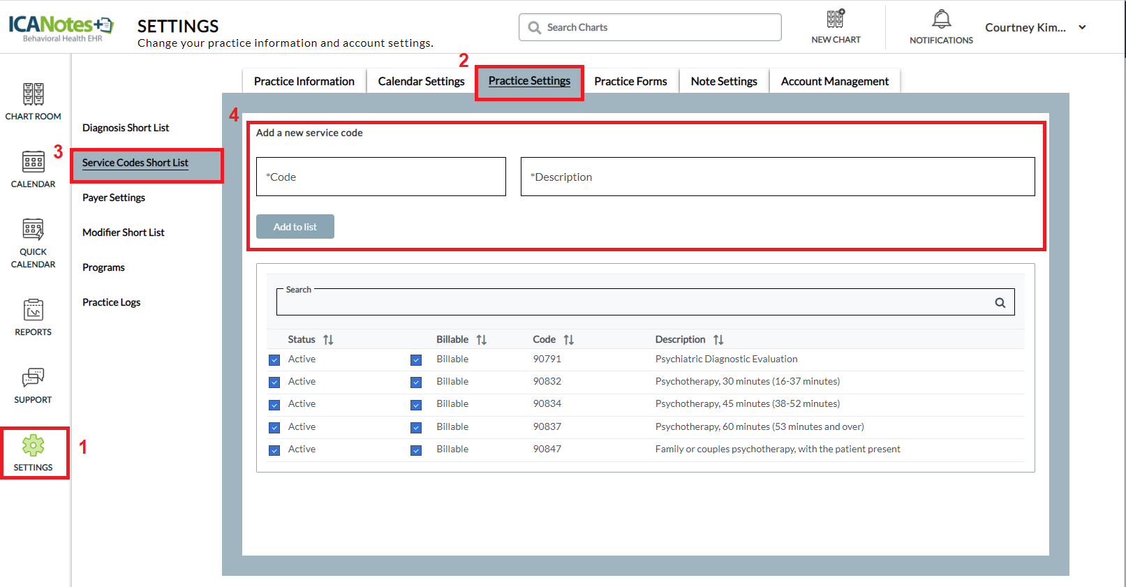 Practice owners and administrators have access to configure Service Codes. Service codes are set up in Settings under the Practice Settings tab. Click on the Service Codes Short List option to set up the service codes used in your practice.
