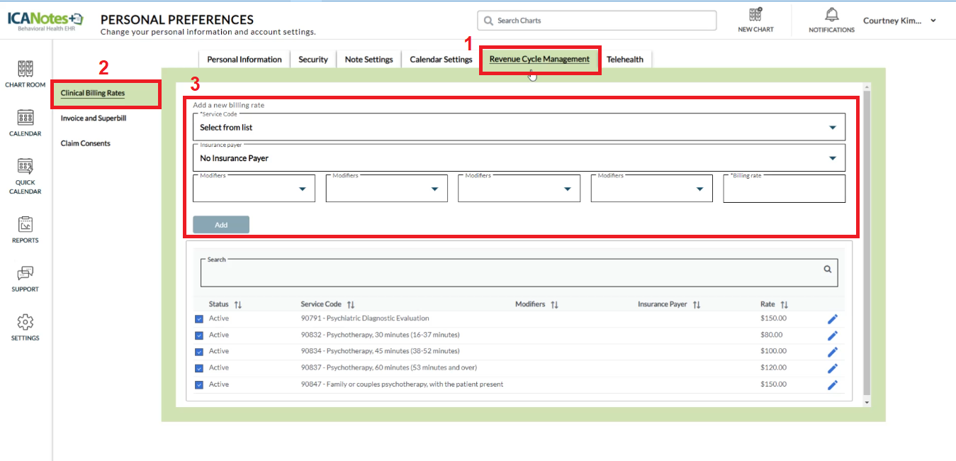 Clinician Billing Rates can be set up in your Personal Preferences under Revenue Cycle Management.