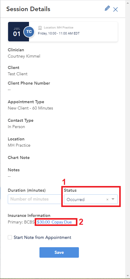 Navigate to the calendar event and click on it to open the event. On the Session Details window, enter the Status "Occurred" and then click on the copay hyperlink to open the payment page.