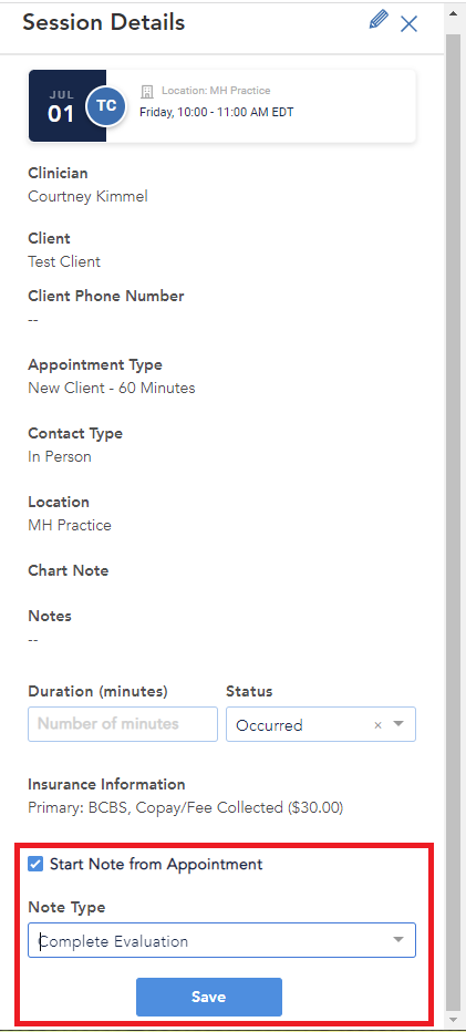 You will be brought back to the Session Details window. Select "Start Note from Appointment" and select the Note Type. Use the Save button to save your session details and launch the note for the session.