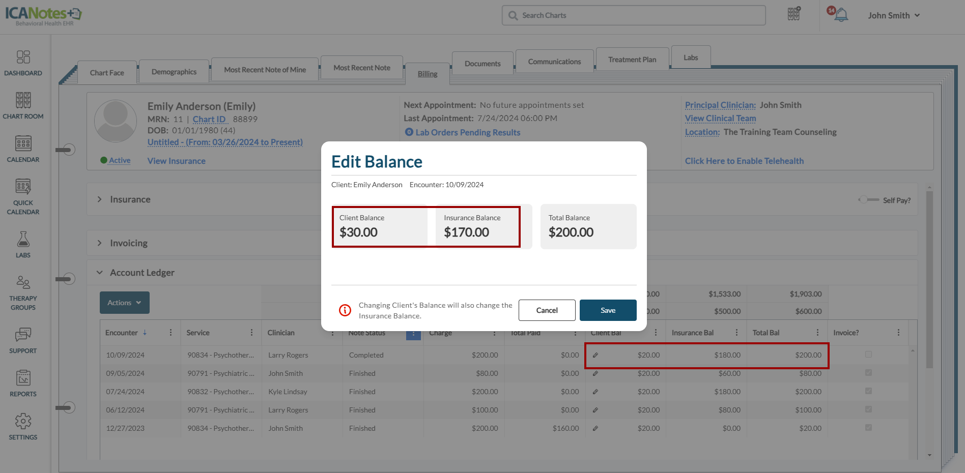 Billers can directly adjust client balances within the Account Ledger section using a new pencil icon in the Client Balance column. This feature ensures that when the client balance is updated, the insurance balance is automatically adjusted.