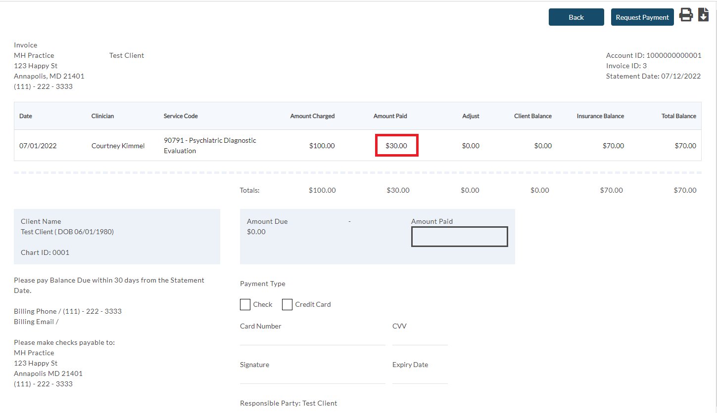 After posting the payment, my client now has a $50 balance on the $100 charge.