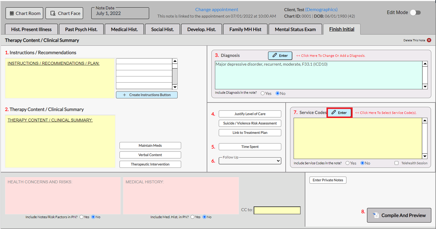 From the work area of your note, navigate to the final tab where you will be able to enter the Service Code. In the example below, I have created a Complete Evaluation and am on the Finish Initial tab. Use the Enter button to enter the appropriate Service Code(s).