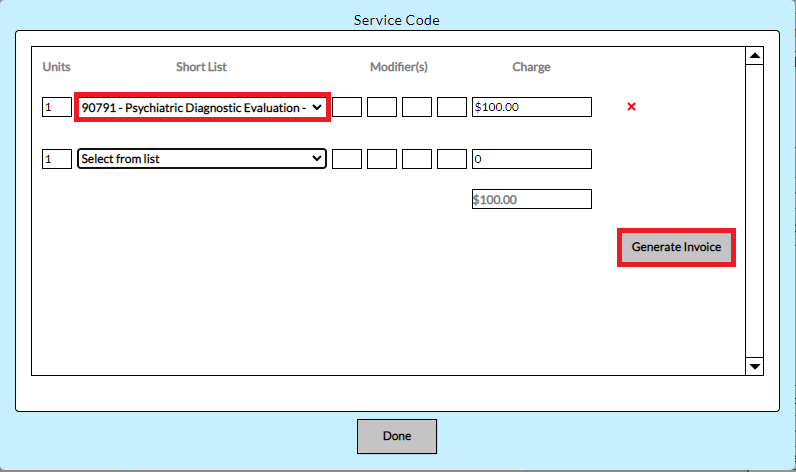 From the Service Code window, select the appropriate code(s) from the Short List. The charge should populate based on what you set up in your Personal Preferences. When ready, click on Generate Invoice which will generate an entry in the client's account ledger.