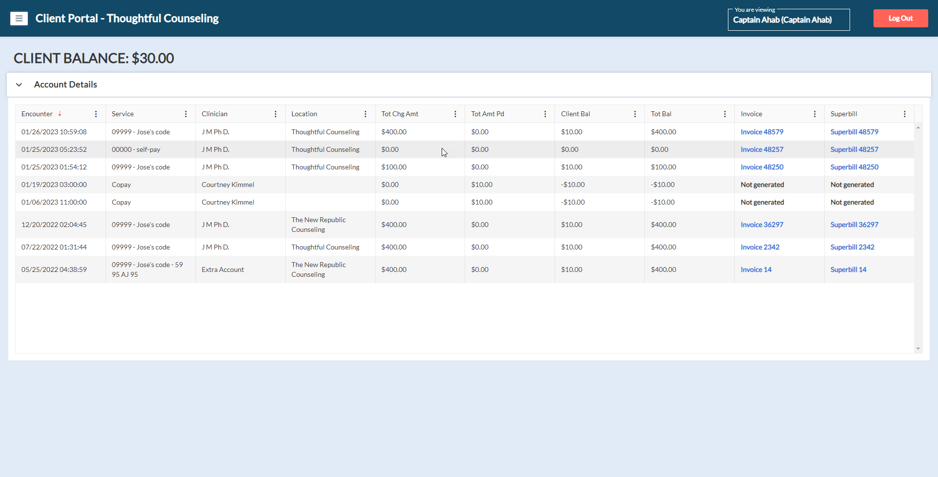 Here, clients have an itemized snapshot of their recent encounters with the ability to sort and filter specific details, and download copies of invoices and/or superbills generated by the practice from the note. Details include: