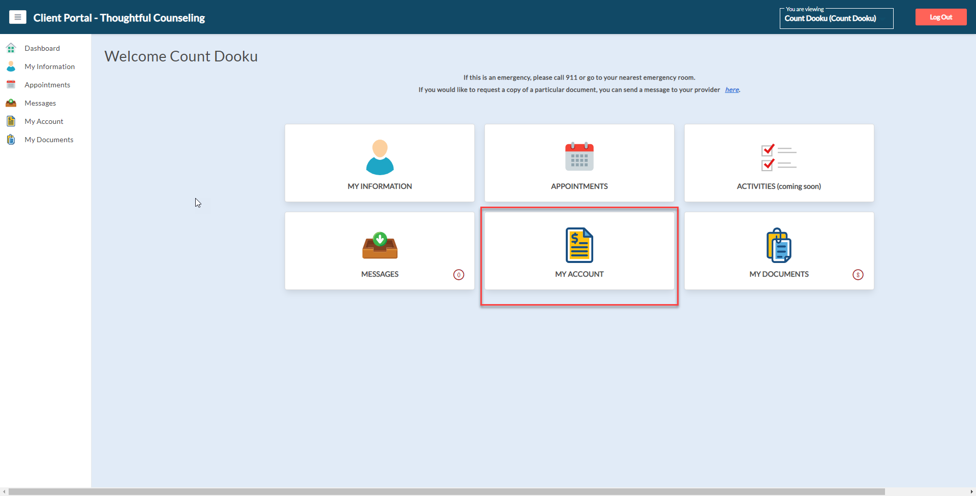 To view their account information, Clients can login to MentalHealthChart with their established credentials, and navigate to My Account.