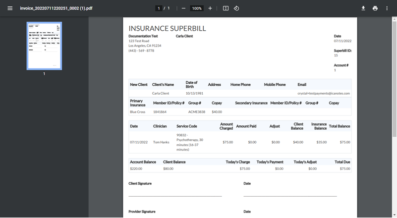 Clicking either the Invoice or Superbill for each itemized claim will download a PDF copy of the requested document for the client's records. If not automatically prompted to select a destination folder, Clients should check their browser's default Downloads location. For those using Chrome, they should see downloads in the bottom left corner of the browser window.