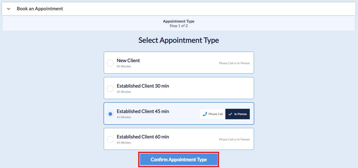 - Choose from available appointment types (e.g., in-person, phone, video).