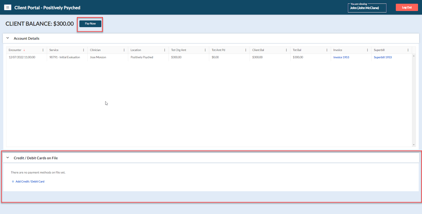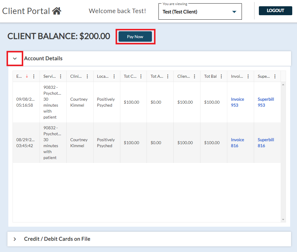 If these features are enabled by your practice, clients will see additional options such as Pay Now and Credit/Debit Cards on File within the My Account section.