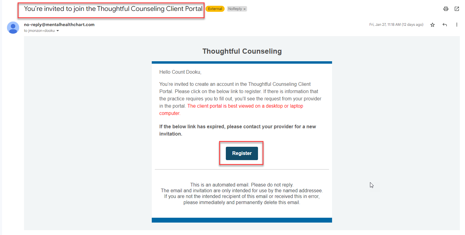 To grant portal access, your staff must initiate the registration from the client’s chart. This action sends an email to the client containing a registration link.