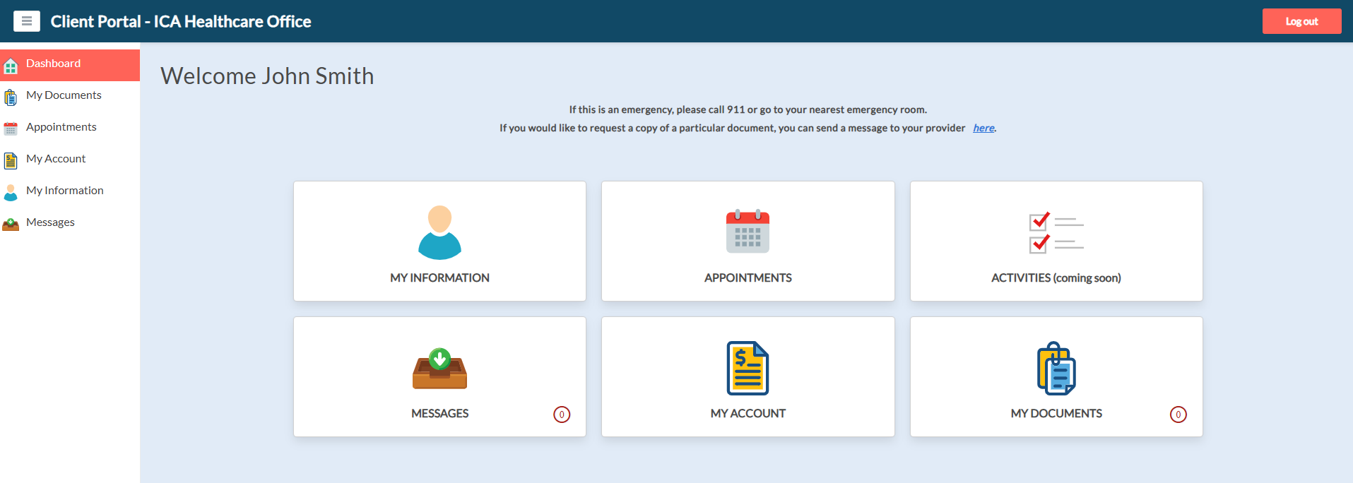 After logging in, clients land on the Dashboard, which provides access to key areas such as: