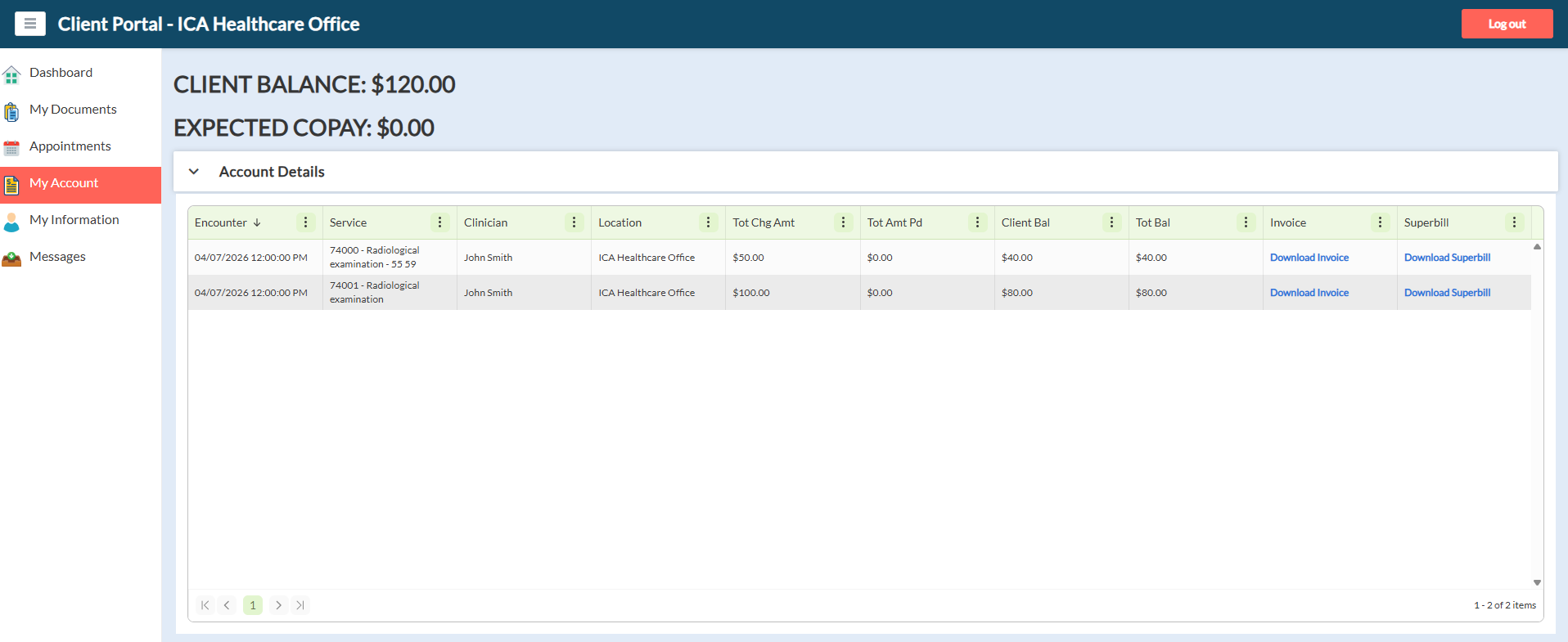 View and Filter Account History: Access an itemized list of encounters, including service descriptions, clinician names, and payment status.