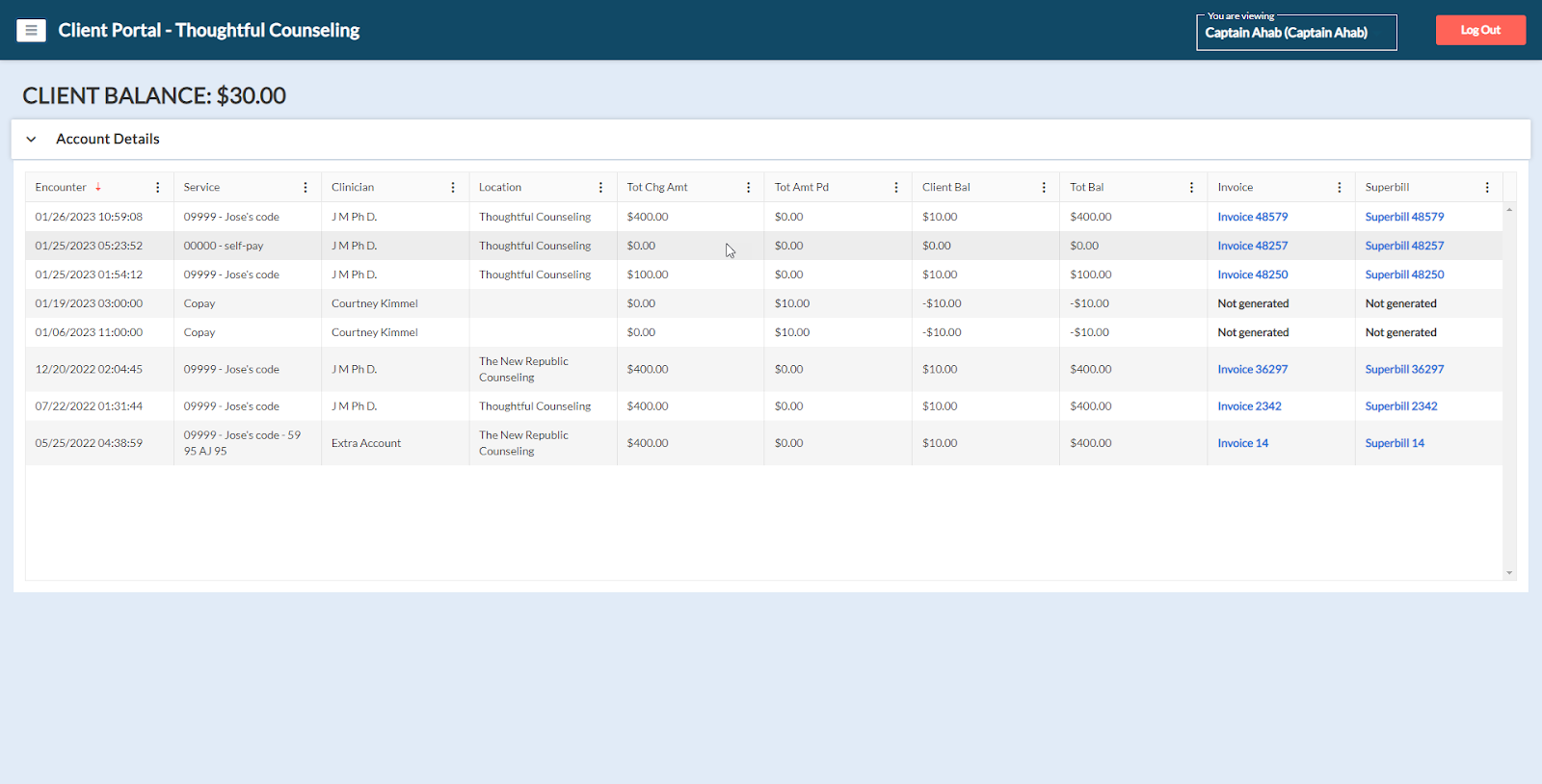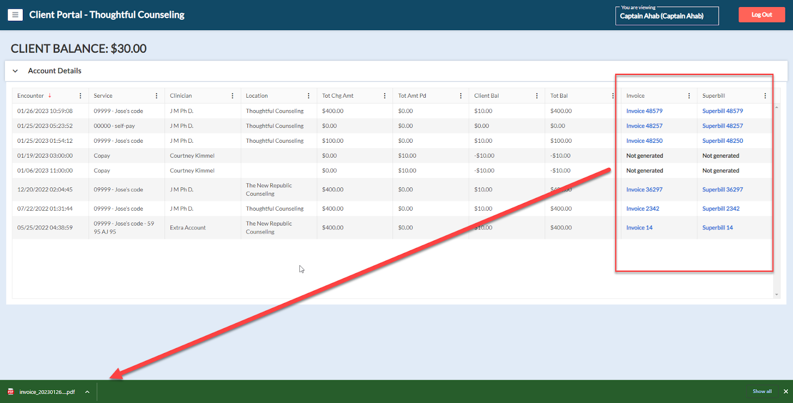 The following is an example of how a downloaded superbill appears to the client: