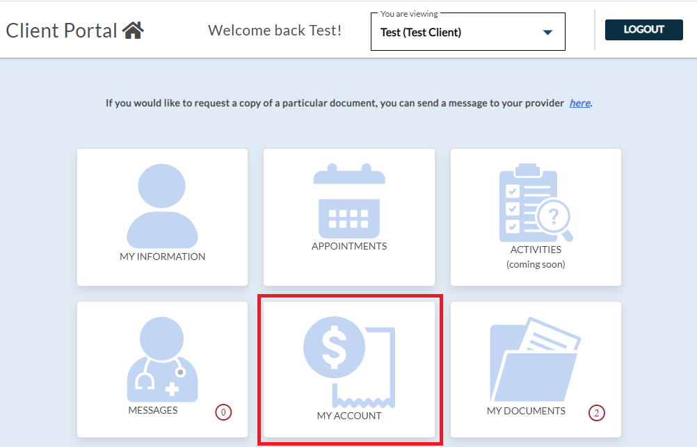 The client will log into their portal at https://myportal.icanotes.com/login and navigate to My Account.