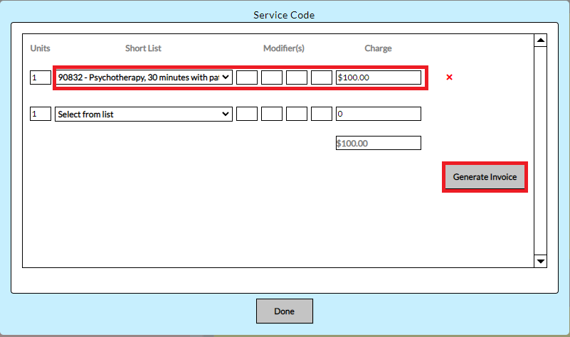 The Service Code window will appear. Select your code from the menu. The billing rate will populate automatically if you've associated a rate with the code you selected. Click Generate Invoice once a service code and charge amount have been selected.