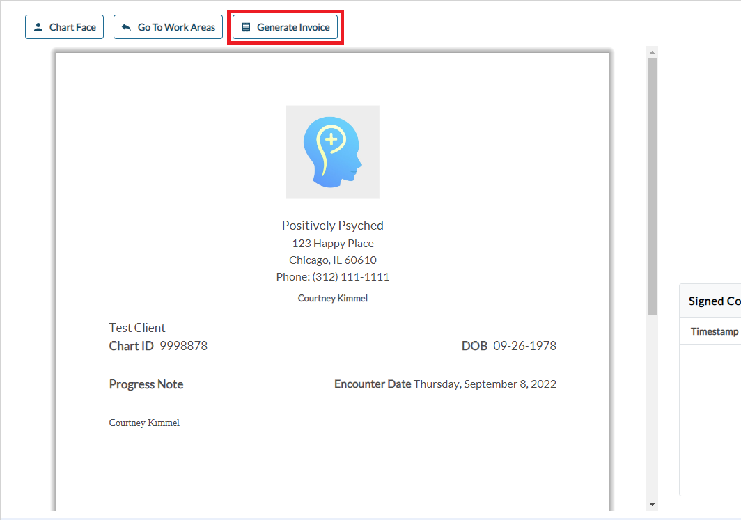 If you've already finished your note and the note contains a service code and billing rate, you may generate an invoice from the Compiled Note page. Use the Generate Invoice button above the note to do so.