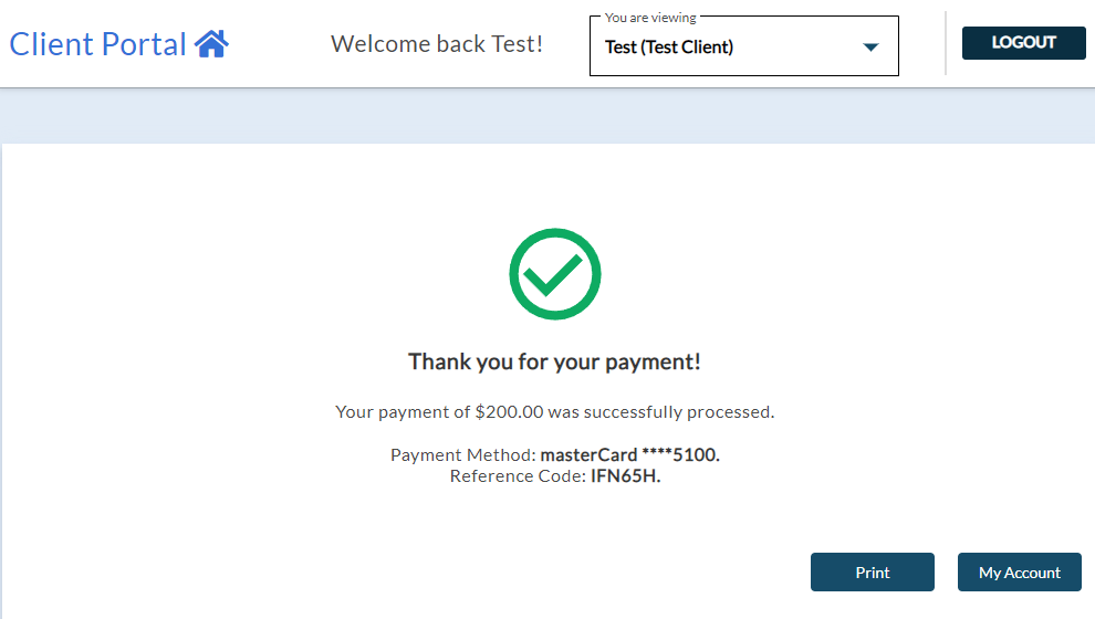 The client's Account Ledger, located in the Billing tab of the client's chart, will update automatically as soon as the payment is processed.