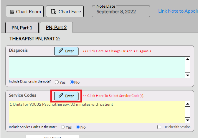From the work area of your note, navigate to the final tab to enter the Service Codes for the session.