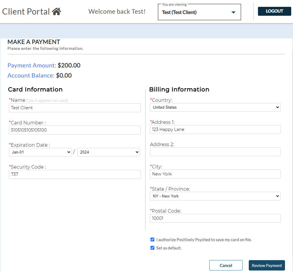 They will have the option to allow the practice to save the card on file and to set this card as their default card on file. After clicking Review Payment, they will be given an opportunity to review the payment details before submitting.