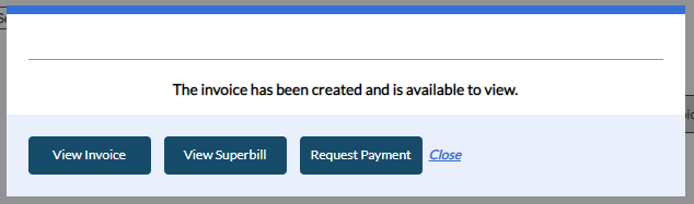 You will have the options to View Invoice, View Superbill, Request Payment or Close. When ready, select Close to return to the work areas of your note. Your invoice has been generated and will appear in the client portal. The client may now make a payment via the portal.