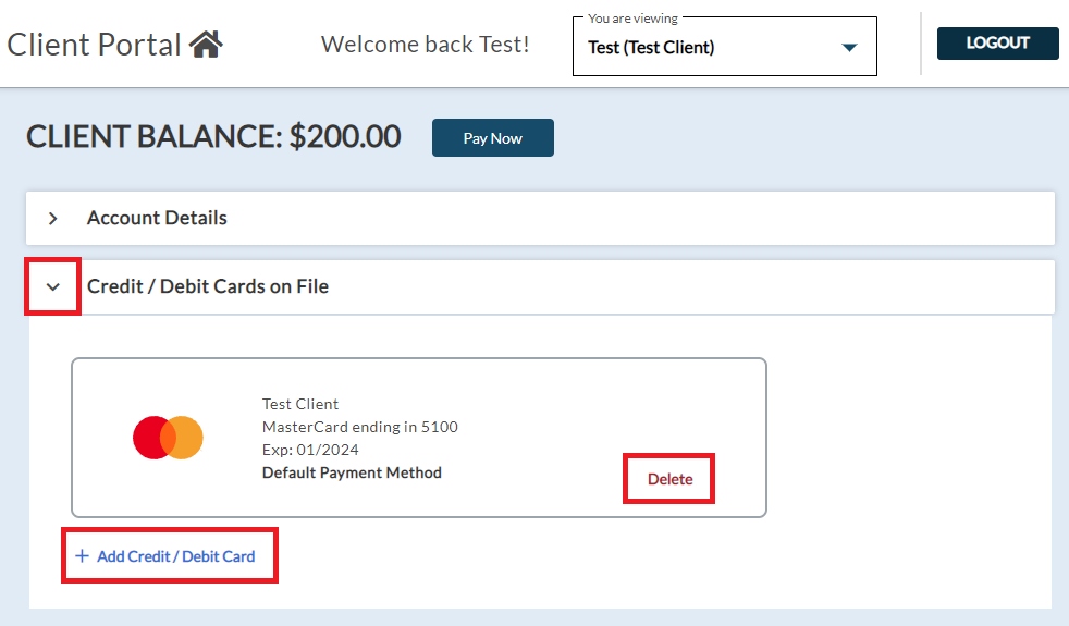 Client's will also have the ability to review, add, remove and edit their cards on file from the My Account section of their portal. To do so, they will expand the Credit/Debit Cards on File section.