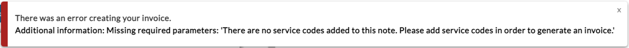 If you attempt to generate an invoice from the Compiled Note page but a service code is missing from your note, you will receive an error prompting you to enter the Work Area and document a service code and billing rate.