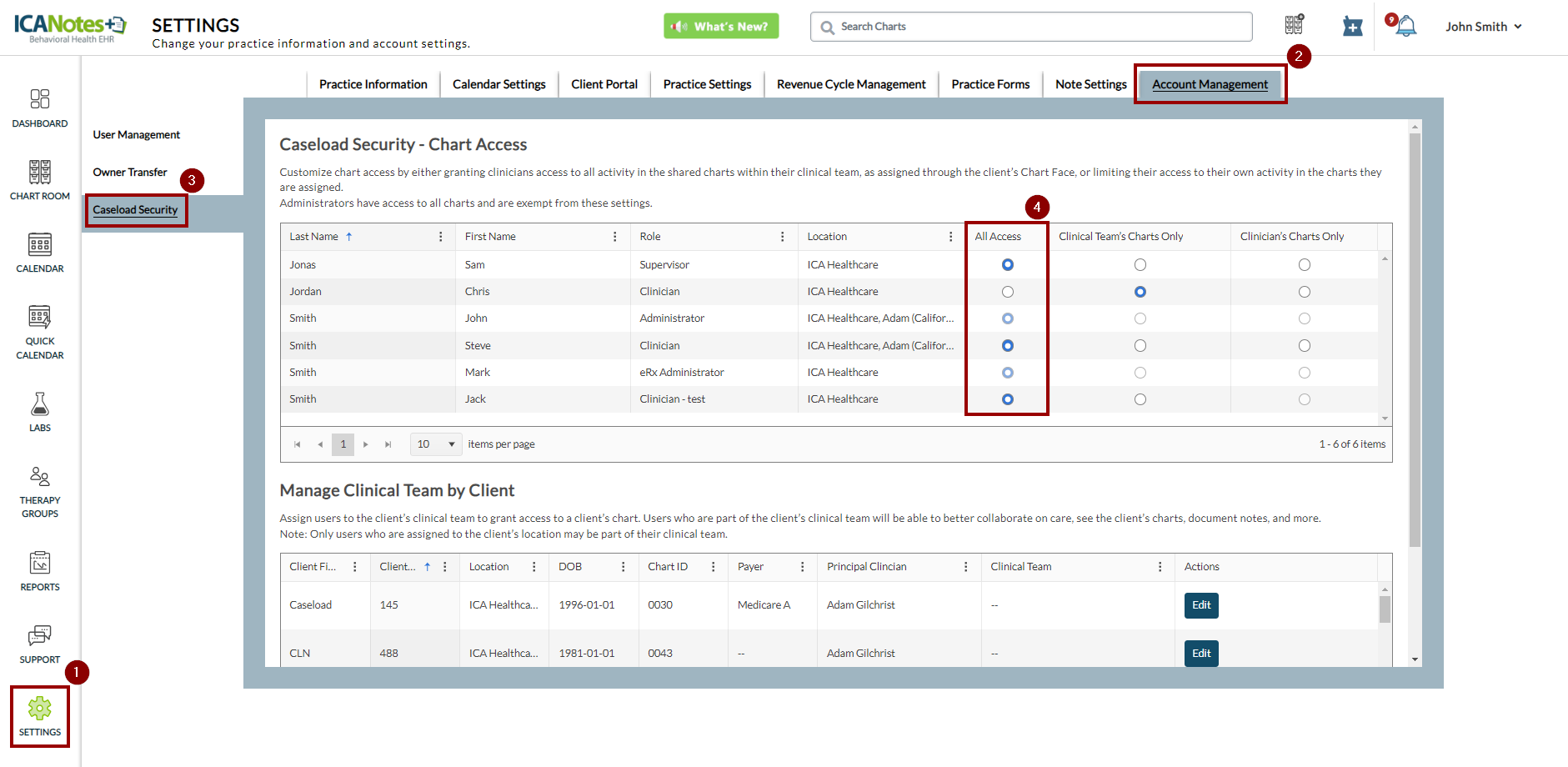 If the clinician is granted access to the "Clinical Team's Charts Only" feature (for instance, refer to the example of locating "Jordan Chris" in the screen above), it is required for that clinician to be a part of the clinician team. Please refer to the screenshot below for instructions on adding members to the clinical team.