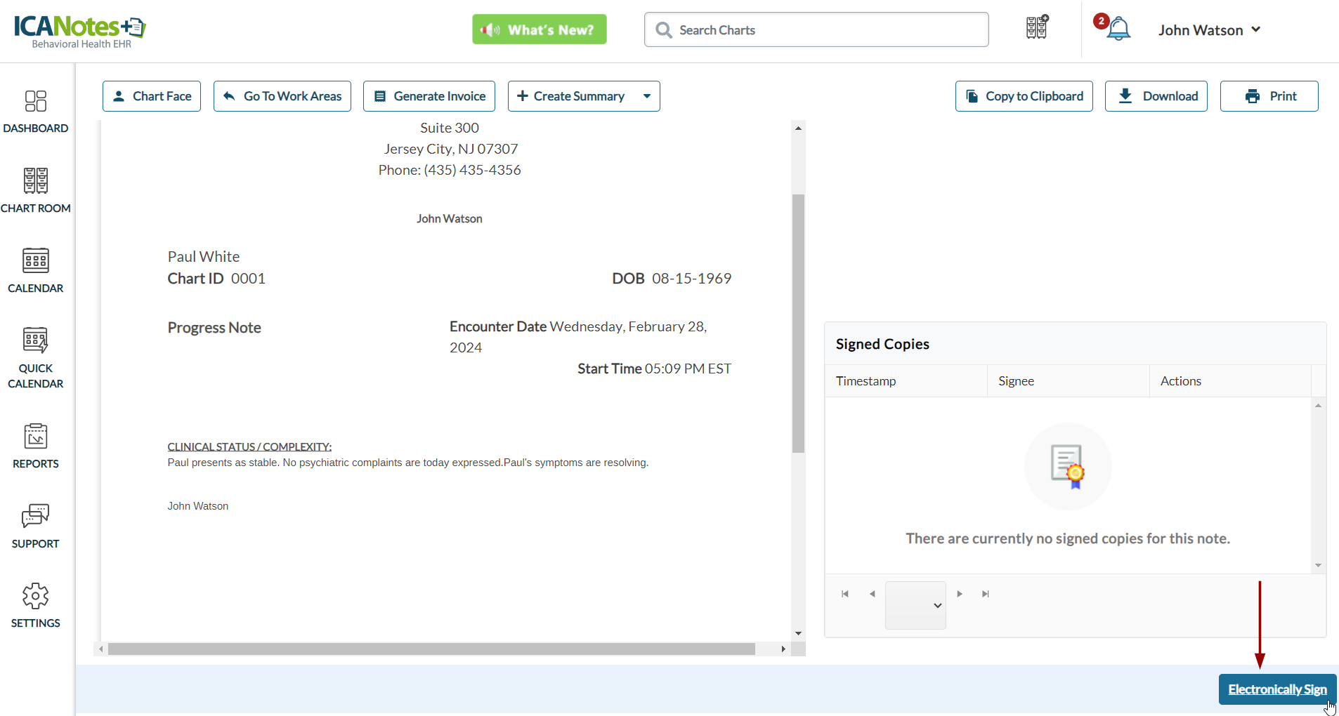 The provider has the capability to initiate co-signature requests for various types of notes. In this instance, we will illustrate with a Progress Note. After compiling the note, the provider must initially sign it by clicking the "Electronically Sign" button, as shown on the screen below: