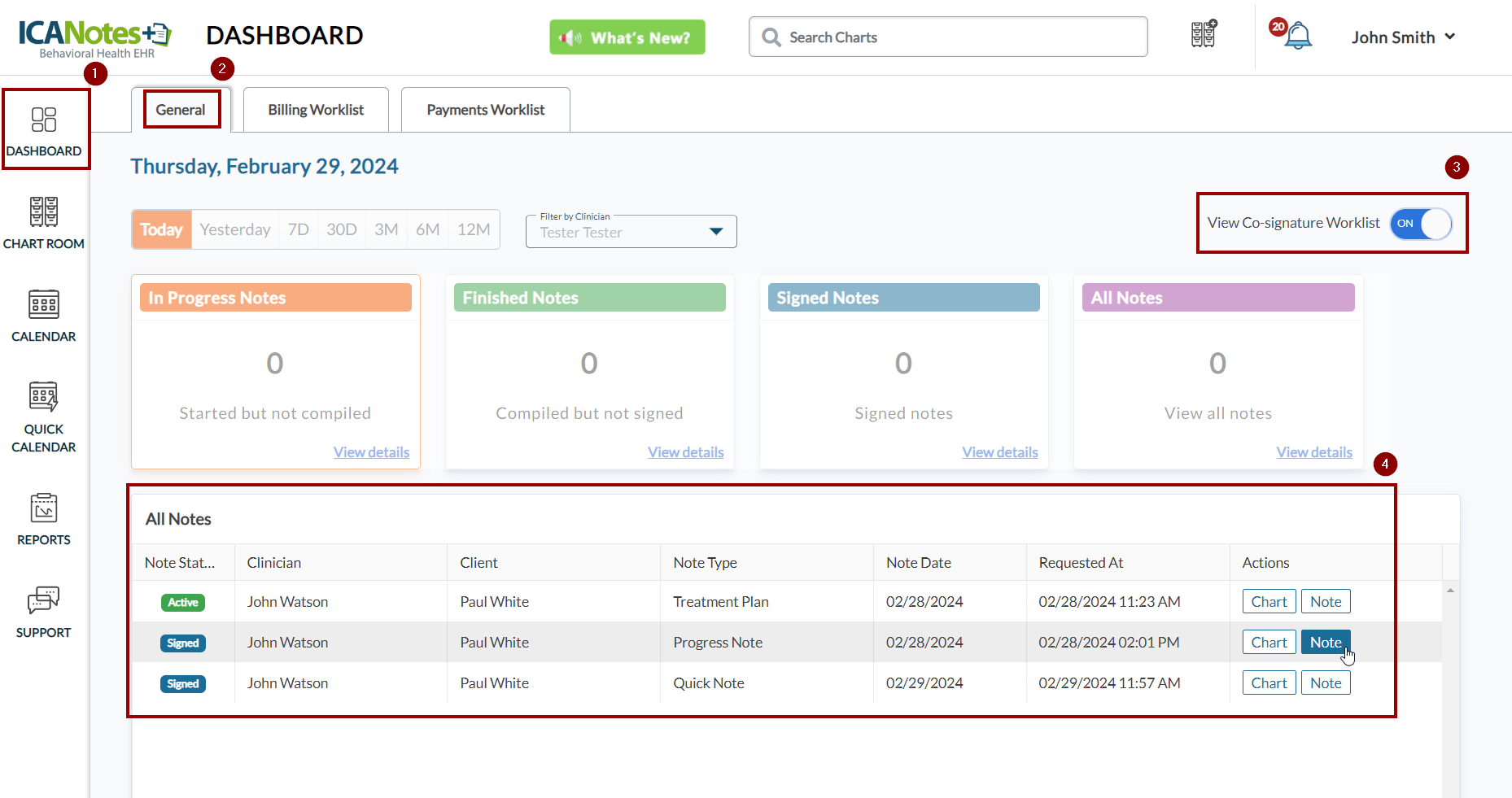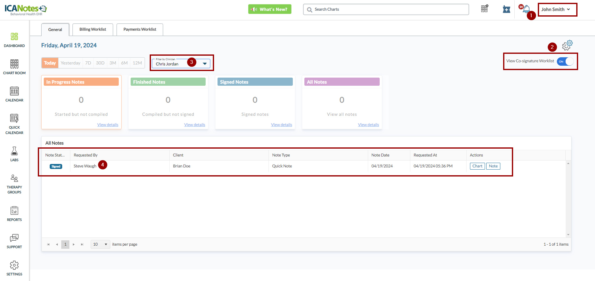 When the administrator (John Smith) accesses the Dashboard to view co-signature requests, it will display as depicted below. However, if administrators wish to view co-signature requests sent to other clinicians, they can choose the clinician from the dropdown menu, as illustrated below, to access co-signature requests sent to them.