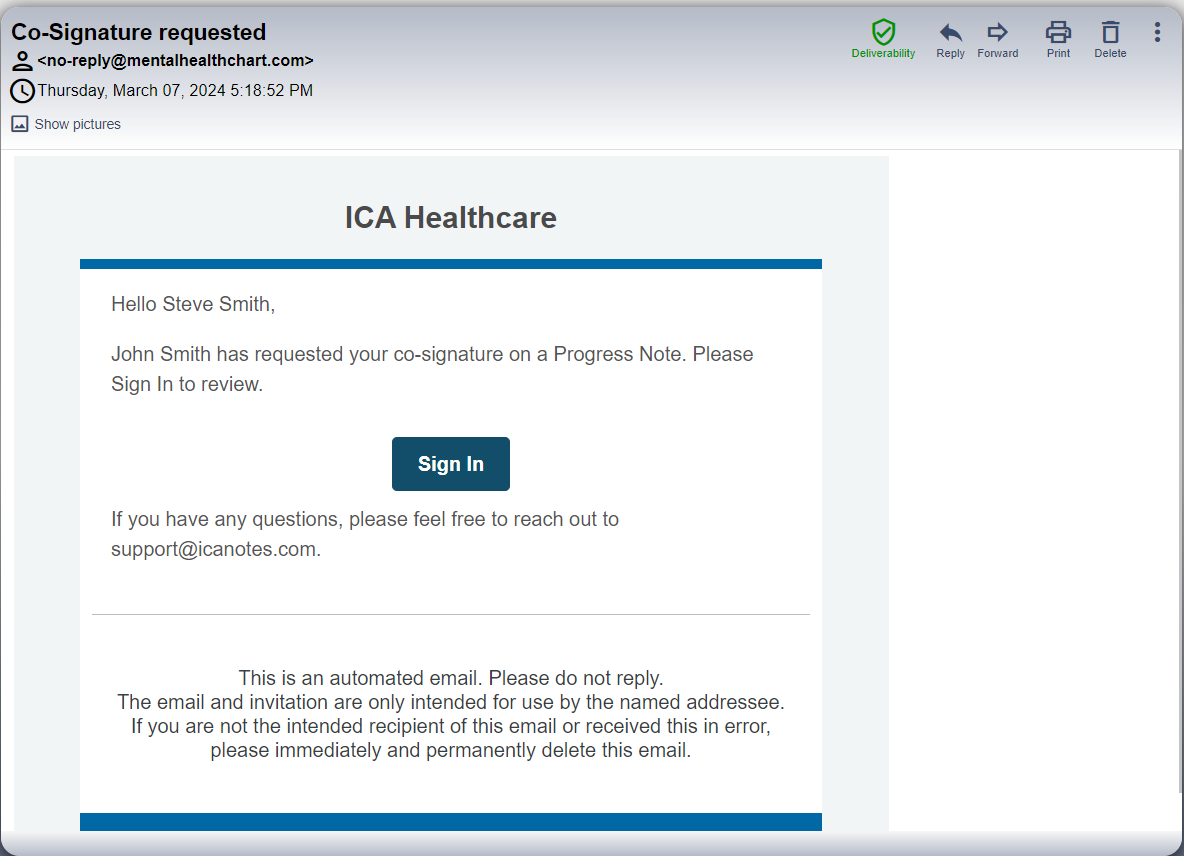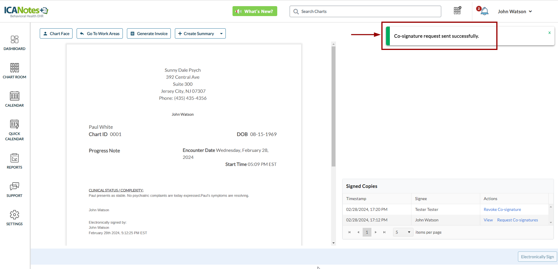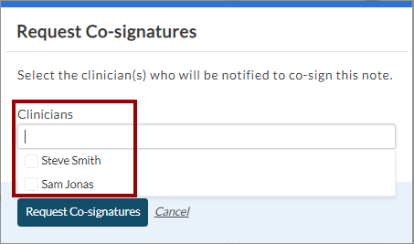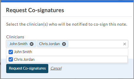 For example, in the scenario provided, a user has sent a co-signature request to clinician Chris Jordan and administrator John Smith.